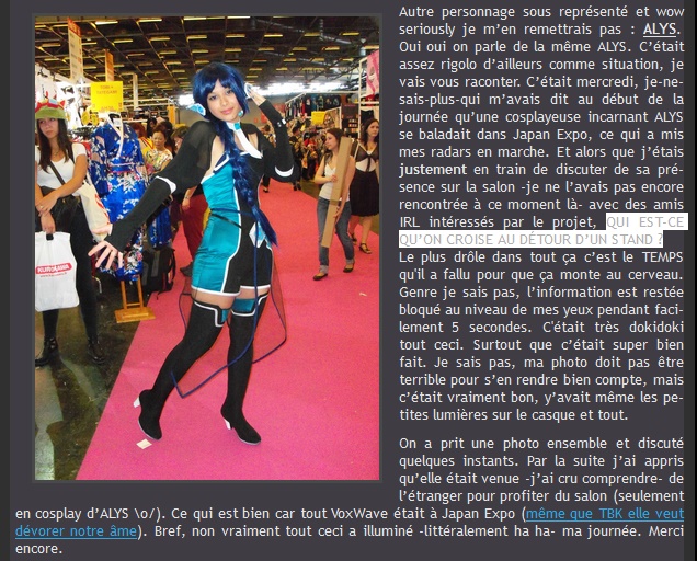 C’est aussi bête qu’agréable, cette année j’ai l’impression pu revoir PAS MAL DE MONDE de mes internets préférés, que j’ai pas vu depuis longtemps (l’an dernier pour la plupart, deux ans ou plus pour d’autres). Ou du moins, vous m’avez tous terriblement manqué. Genre, mes potes de Vocaloid.fr (je vais pas me mettre à citer des noms parce que ce serai long mais genre, Estrelia, Furabi et Ushi, j’ai l’impression que ça fait une éternité qu’on s’est pas parlé et même si ça a été court ça m’a fait PLAISIR sachez le (Eromena et Chib je vous aime)), de VoxWave (Saphirya, Joffrey, Drak-Pa, TBK, cœur avec les mains et DU COURAGE pour développer LEORA è_é), Tatsuki et les touhouistes que j’ai rencontré y’a deux ans pendant les tournois (Dahel, Maria, Pooshi, Oni Dango et tout-les-autres-dont-les-pseudo-me-reviennent-pas-immédiatement-en-tête-parce-que-je-suis-HS, je vous cœur avec les mains). À tout ce beau monde : merci de rendre mes internets meilleurs, ces retrouvailles m’emplissent de détermination.